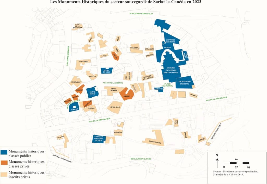 Sarlat dispose d’un patrimoine d’exception. Parmi eux, 15 Monuments Historiques sont sa propriété directe, soit 10 classés et 5 inscrits.