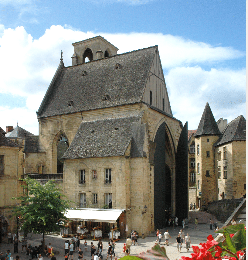 En 1365, lors d’une période d’accalmie de la guerre de Cent Ans, les consuls de Sarlat décident de reconstruire l’église paroissiale. Pour cela, ils font raser la vieille « ecclesia Sanctae Mariae de Mercato ou Mercais ». Après plusieurs périodes d’interruption, ces travaux sont achevés en 1507. En effet, la guerre de Cent Ans reprend en 1370 et oblige de stopper le chantier. Seuls la travée adjacente et le choeur sont finis. En 1479, le chantier reprend avec le clocher, la travée à l’ouest et l’une des façades. Au XVIIe siècle, la chapelle latérale, dédiée à Notre-Dame-de-Pitié, appartient à la puissante famille de Gérard. Elle y installe une sculpture de Louis Gilet, une Pietà visible aujourd’hui dans la cathédrale. Après la Révolution, elle devient un club, une usine de salpêtre et une manufacture d’armes. Vendue comme bien national en 1796, elle est parcellisée en 1815. L’un des nouveaux propriétaires, Barthélémy de Grézel, démolit l’ancien choeur pour en vendre les pierres tandis que la chapelle sud accueille habitations et boutiques. Au XXe siècle, véritable ruine, elle abrite successivement un hôtel des postes, une boulangerie, un dispensaire et diverses associations. Elle est classée depuis 1905 au titre des Monuments Historiques. En 2001, l’architecte Jean Nouvel réhabilite l’église Sainte Marie en marché couvert et propose de créer à l’étage des espaces culturels. La verrière est remplacée par deux imposantes portes en acier. Enfin, en 2012, un ascenseur panoramique est installé dans l’ancien clocher.