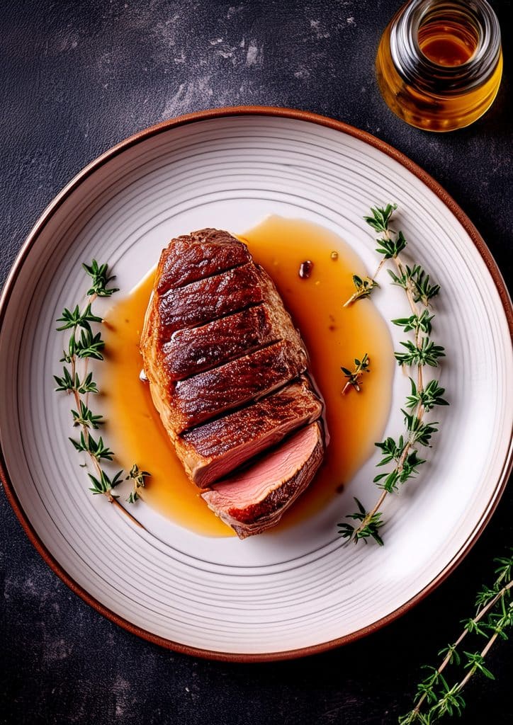 - Caramélisation et assaisonnement : Si vous avez réservé la marinade, versez-la en fin de cuisson dans la poêle pour en napper le magret et créer un jus sirupeux. Retirez le magret du feu et salez-le généreusement. Laissez-le reposer 5 minutes sous un papier d’aluminium (la viande se détend et les jus se répartissent).