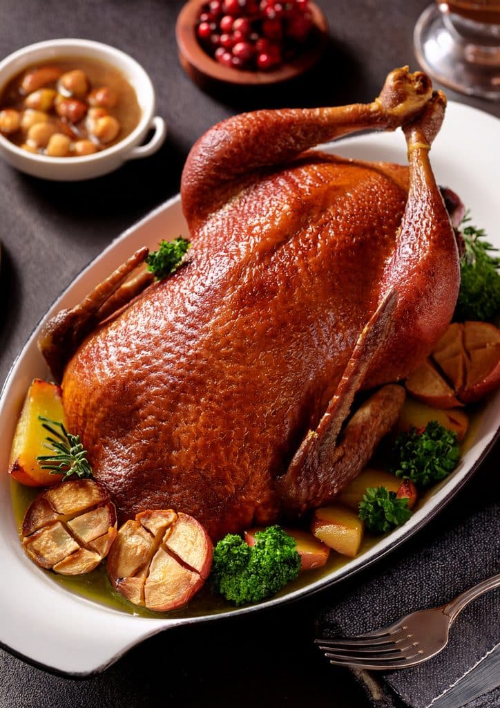 - Soins en fin de cuisson : Vérifiez la cuisson en piquant la jointure de la cuisse – le jus doit sortir clair. Lorsque l’oie est cuite (peau bien dorée et croustillante, cuisses qui se détachent légèrement), sortez-la du four. Couvrez-la d’une double feuille d’aluminium et laissez-la reposer 15 minutes (dans le four éteint et ouvert, par exemple). Ce repos permet à la viande de se détendre, pour une chair plus juteuse et facilite la découpe. Pendant ce temps, filtrez le jus de cuisson dans une casserole, dégraissez-le en retirant la couche de gras en surface, puis faites éventuellement réduire le jus quelques minutes sur feu vif et rectifiez l’assaisonnement.