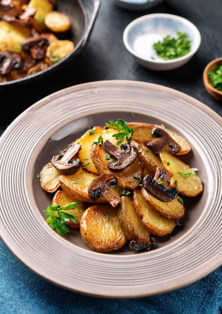 - Assaisonnement et finition : Pendant ce temps, épluchez l’ail et hachez-le finement. Ciselez le persil. Au bout des 15 minutes de cuisson, ajoutez l’ail haché et le persil aux pommes de terre. Mélangez bien. Couvrez la poêle et poursuivez la cuisson à feu doux encore ~15 minutes. Les pommes de terre vont confire doucement dans la graisse et devenir fondantes. En fin de cuisson, salez et poivrez à votre convenance.