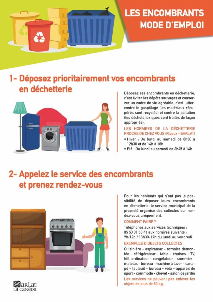 Vous ne pouvez pas vous déplacer à la déchetterie ? Le service municipal de la propreté organise des collectes des encombrants volumineux, tous les premiers et troisièmes mardis du mois sur rendez-vous uniquement. Appelez les services techniques au 05 53 31 53 41 du lundi au vendredi de 9h à 12h et de 13h30 à 17h pour convenir d’une date.