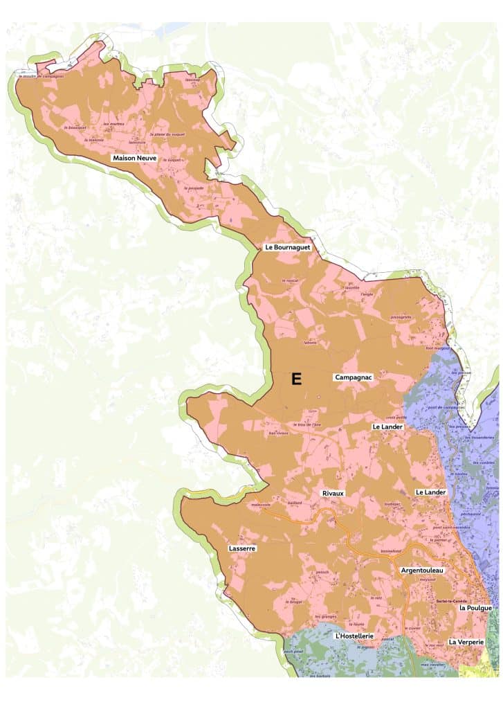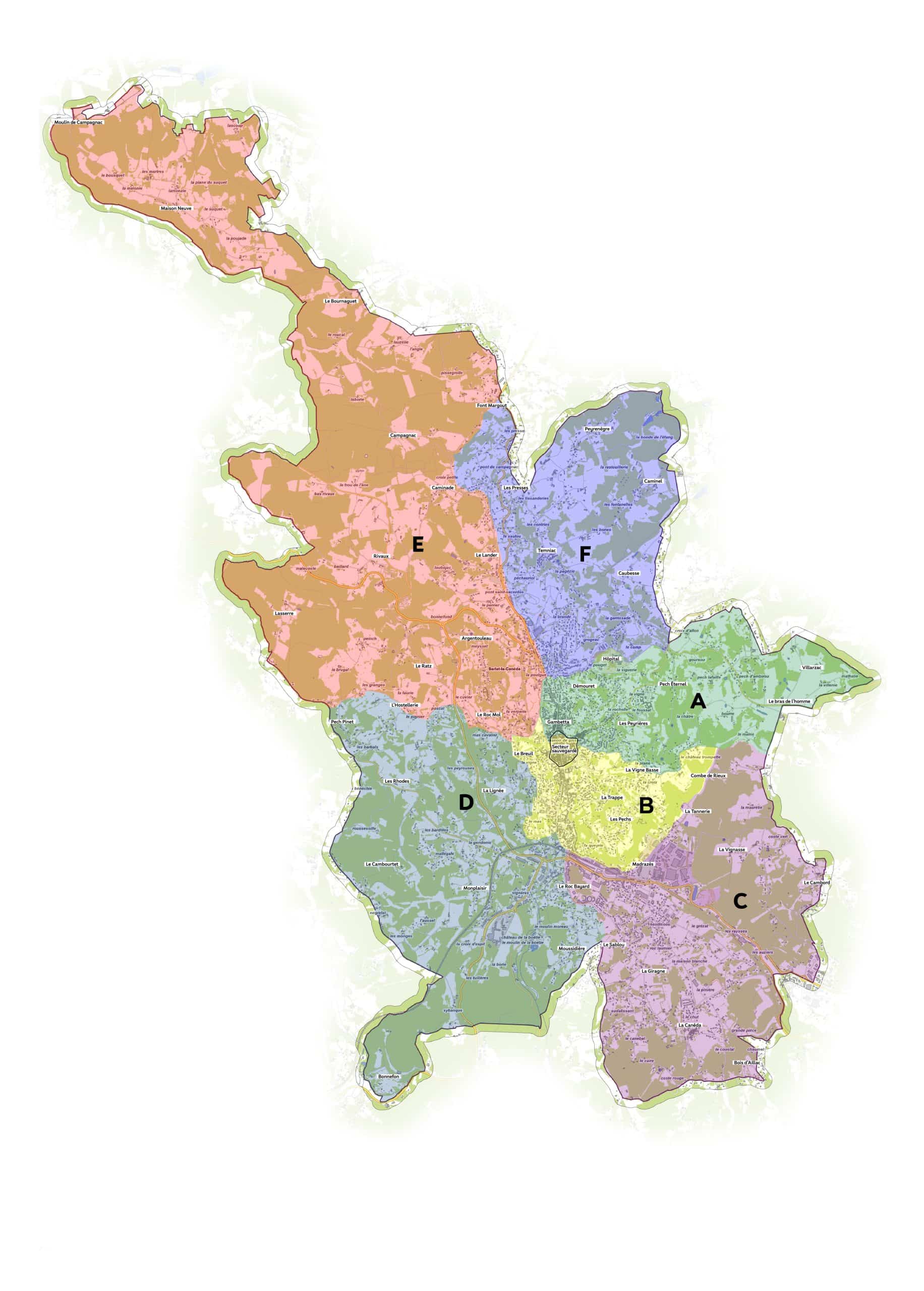 Chemins de Caminade Est, de Font Margout, de l’Harmonie, de la Combe, de la Louise, de Lascoup, de Lasserre, de Loubéjac, de Loubéjac Haut, de Mespech, de Péchauriol, de Peinch, de Rivaux, des Jeunes Années, des Tilleuls, du Bois de Campagnac, du Bois de la Pouyade, du Bonheur, du Ratz, du Trou de l’Âne