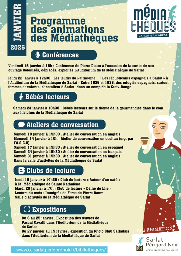 Le réseau des médiathèques Sarlat-Périgord Noir propose, tout au long du mois de janvier 2026, un programme d’animations culturelles varié, ouvert à tous les publics. Expositions, conférences, ateliers de conversation, clubs de lecture et rendez-vous pour les tout-petits rythmeront ce début d’année.